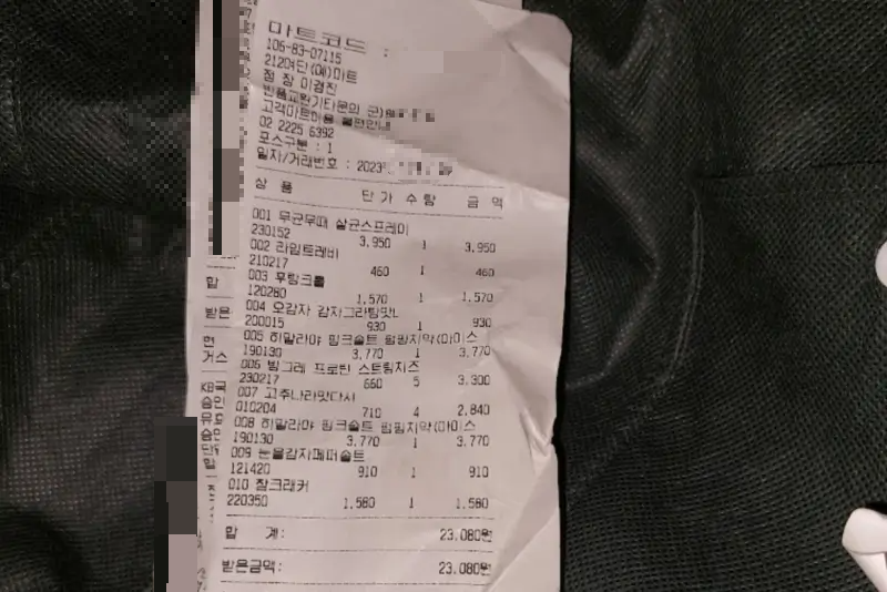 3일 차에 PX에서 구매한 것은 영수증을 남긴다. 영수증에 적혀있는 물건에 대한 후기를 남긴다.
